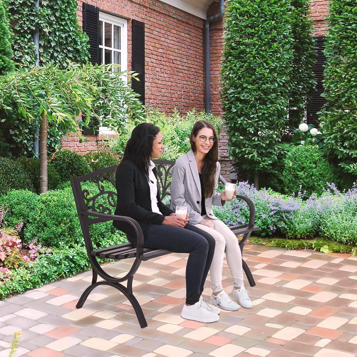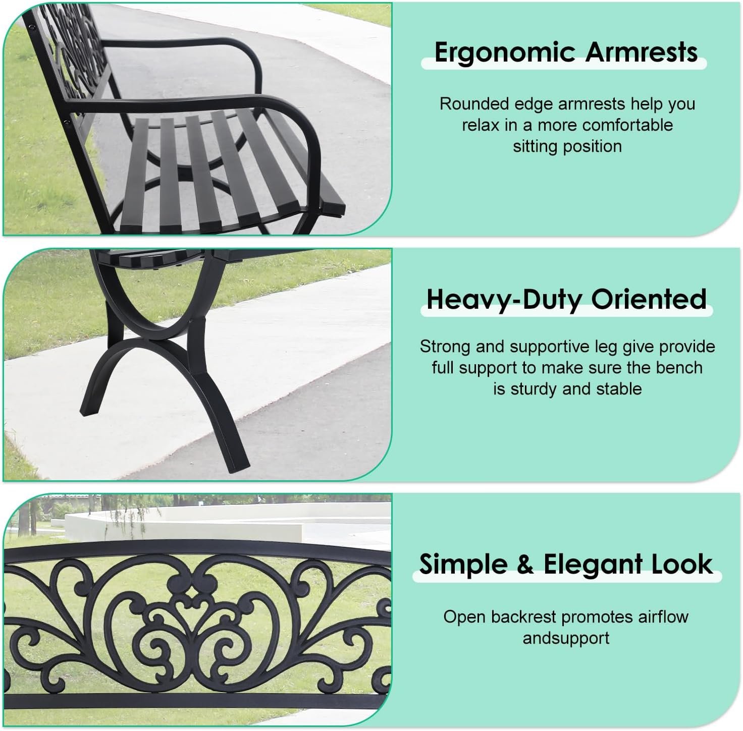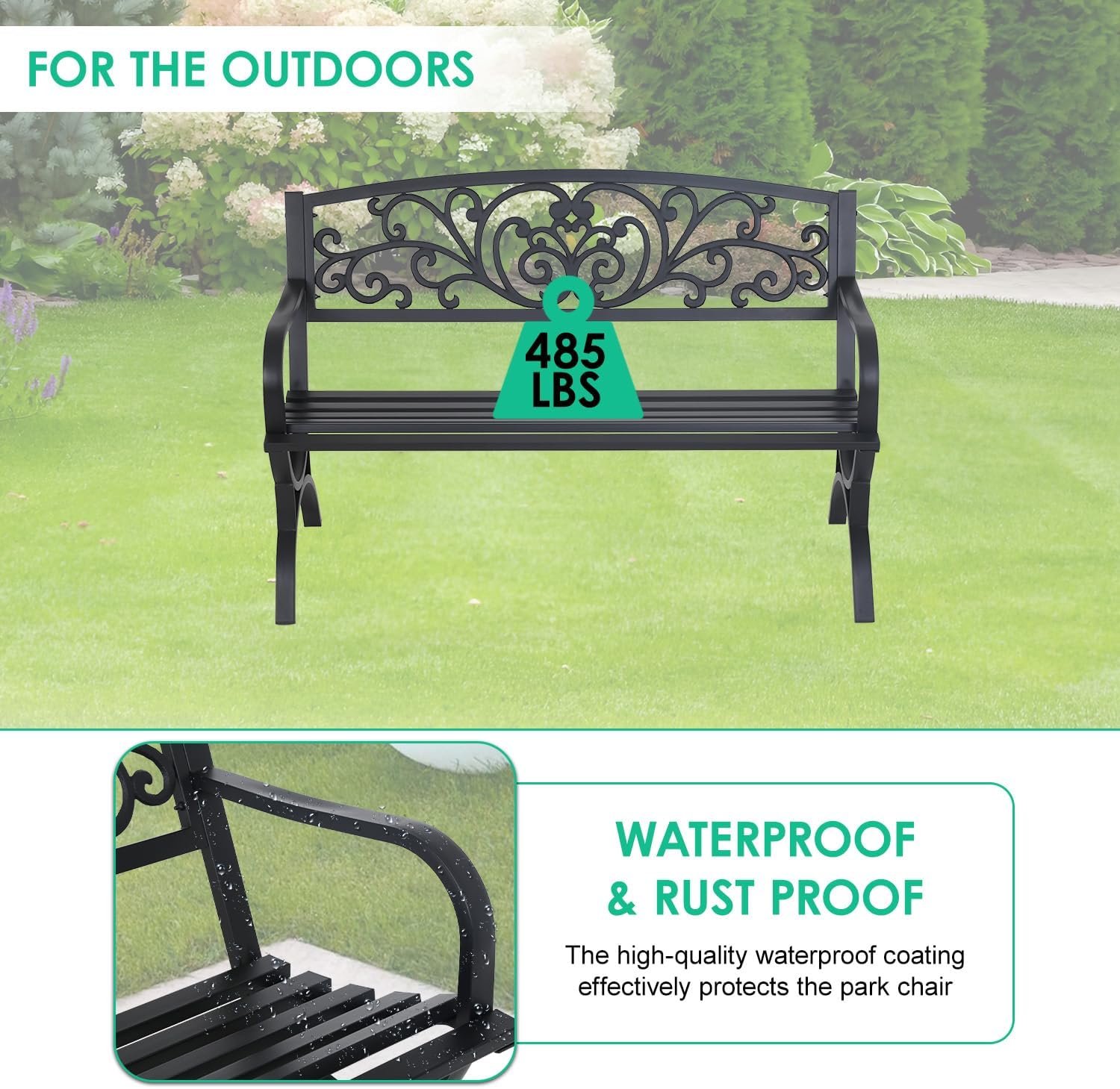 The FDW Outdoor 50″ Garden Bench combines strength and elegance with its powder-coated steel frame and decorative floral backrest. Designed for two people, it supports up to 485 lbs and resists weather for long-lasting outdoor use. Its timeless design makes it a perfect addition to any garden, patio, or porch.